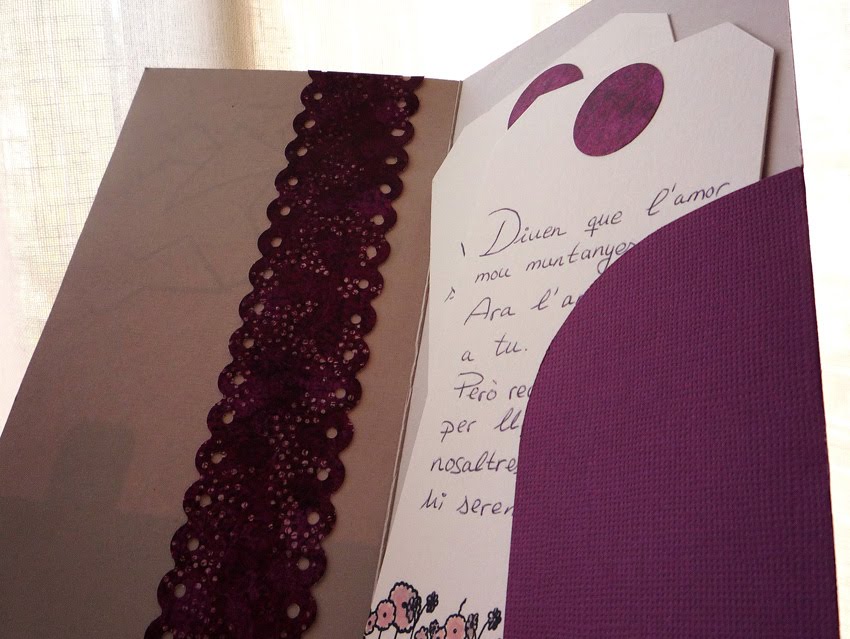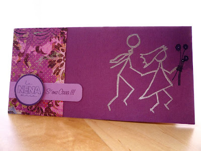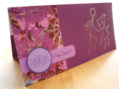 Esta vez os presento una tarjeta un tanto especial, la he hecho para felicitar a una amiga que se casa y también para poner un "vale regalo". He utilizado un formato alargado (20.5x10.5) para que encaje en un sobre alargado tradicional. La base es una cartulina texturizada de doble cara, por fuera es de color magenta y por dentro de un gris muy clarito, casi blanco. Como no tenía ningún sello de novios me he decidido a dibujarlos yo a mano alzada. Yo no dibujo especialmente bien, pero han quedado muy divertidos. Los he repasado con un rotulador de tinta transparente para hacer embossing con polvos plateados. El ramo de la novia es un sello de Aladine estampado con tinta negra y coloreado con rotuladores de ilustración y rotulador de gel blanco.