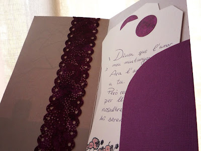 En la parte izquierda de la tarjeta he pegado un trozo de un papel de la colección "Qué será, será" de K&company. Un adorno del kit Rodones Infantils y una cartulina lila que he impreso para completar la frase me han servido para poner el título de la tarjeta: ¡La niña bonita se nos casa!.