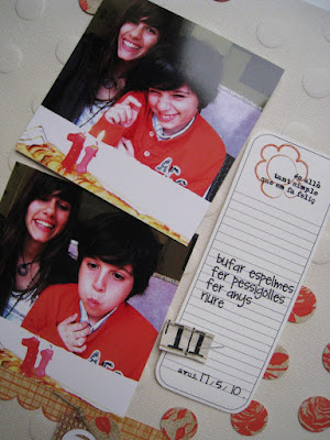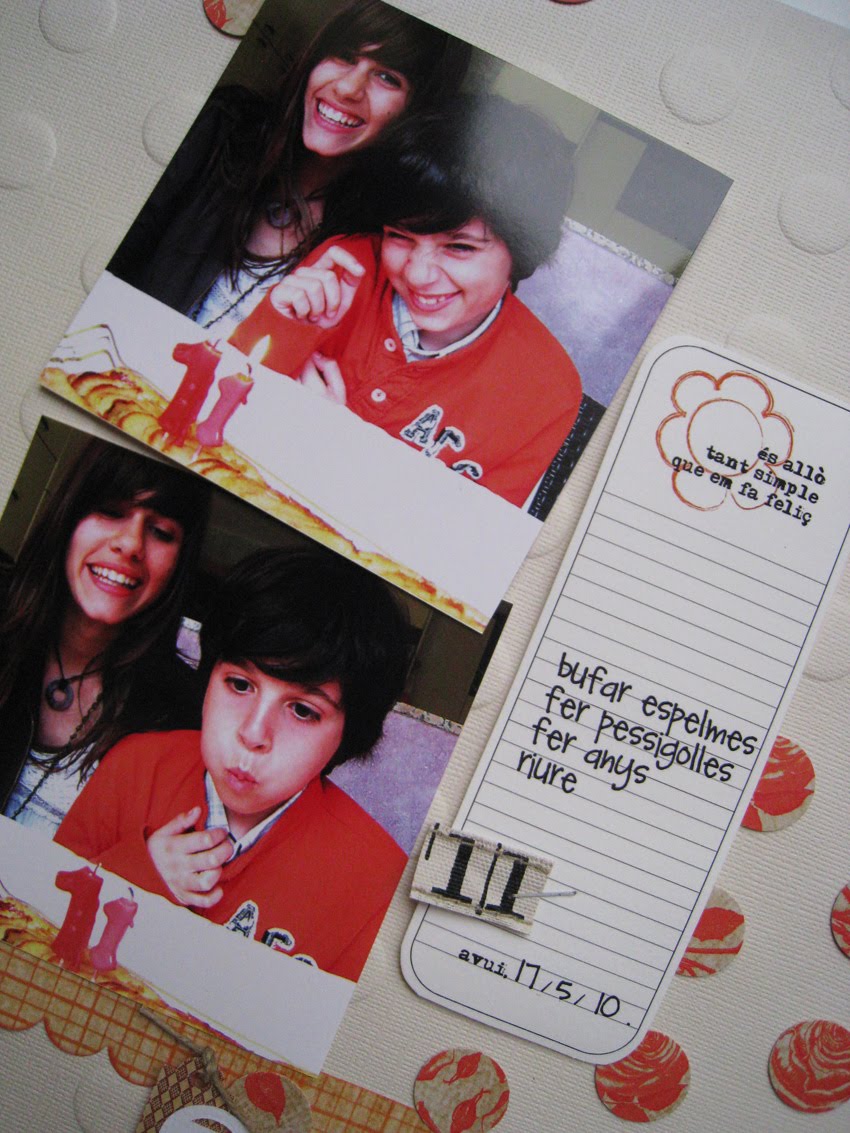 Las fotos son a 10x10 cm y un poco saturadas de color (podéis admirar también mi nueva pintura lila de la cocina) . La foto de arriba la he inclinado y levantado con foam adhesivo porqué he pensado que le daría más dinamismo, mientras que la foto inferior está recta. Evidentemente las fotos son el punto clave de la página y mirando de izquierda a derecha es lo que más nos llama la atención. Pero luego el papel decorado y la etiqueta también buscan su protagonismo, y por ello hay más redondas en la derecha.