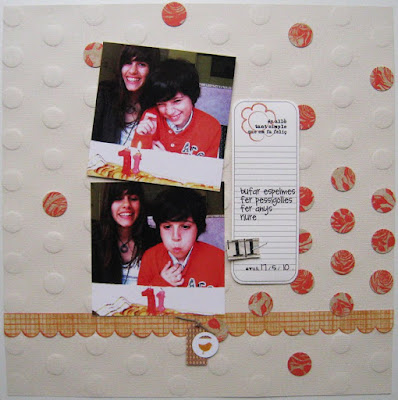 Y bien, de todas maneras, este es mi layout de hoy. La cartulina de base es de Core'Dinations para Jenni Bowlin - Vanilla Cream Large Dots. Por si no ponía redondas por todas partes, ahora además la cartulina ya las lleva. Es genial, y encajan con mi perforadora de 3/4". De manera que he sacado de la caja un papel de Sassafrass de hace como 2 años y he usado la cenefa para adornar y el papel para ir haciendo redondas, que he pegado encima del embossing de la cartulina.