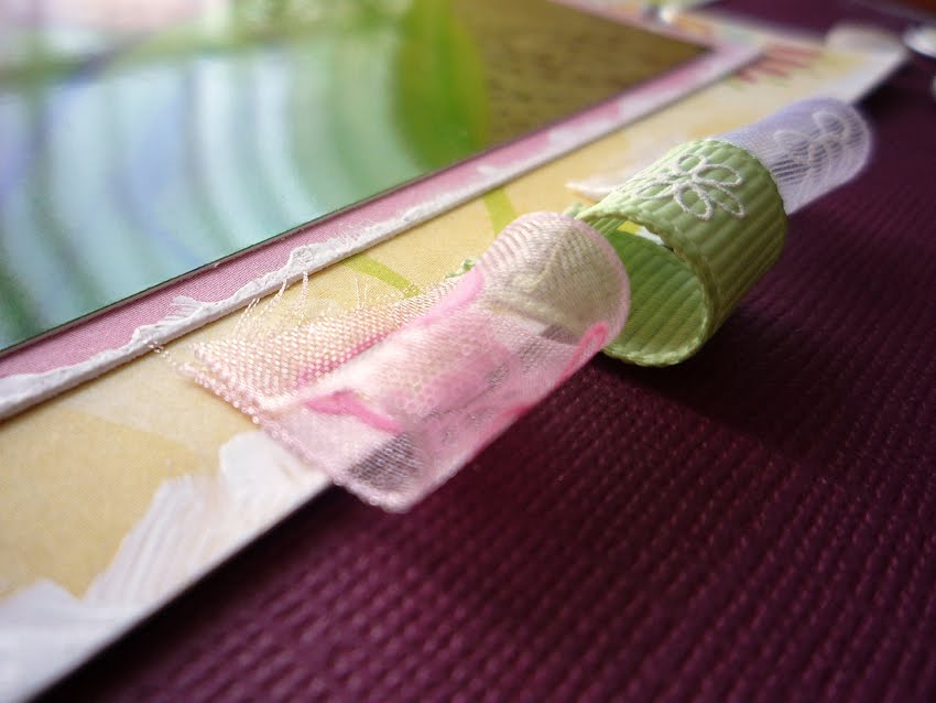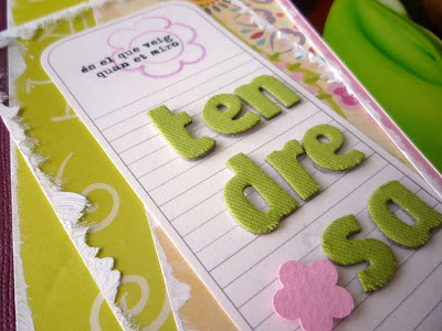 Hoy os enseño la primera página que he dedicado a mi ahijada Judith. La base es una cartulina texturizada en color burdeos sobre la que he puesto dos papeles decorados en tonos verdes y la foto enmarcada con cartulina rosa. Todos los bordes están pintados con pintura acrílica blanca de manera descuidada para suavizarlos y conseguir un efecto empolvado.