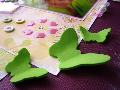 En la parte derecha del LO he puesto tres grupos de tres decoraciones: mariposas de foam, cintas y formas redondas diversas. El repetir el número de decoraciones da unidad a una página que en principio tiene muchos elementos diferentes.