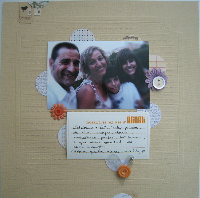 La disposición de los dos elementos es central y la decoración gira alrededor de ellos. He utilizado un papel decorado de la colección On Holiday de Girls'Paperie, que tiene estas bonitas redondas decoradas de 1 1/2", listas para perforar. La foto y etiqueta están pegadas a la cartulina con foam adhesivo, por lo que quedan más elevadas y de debajo aparecen las redondas.