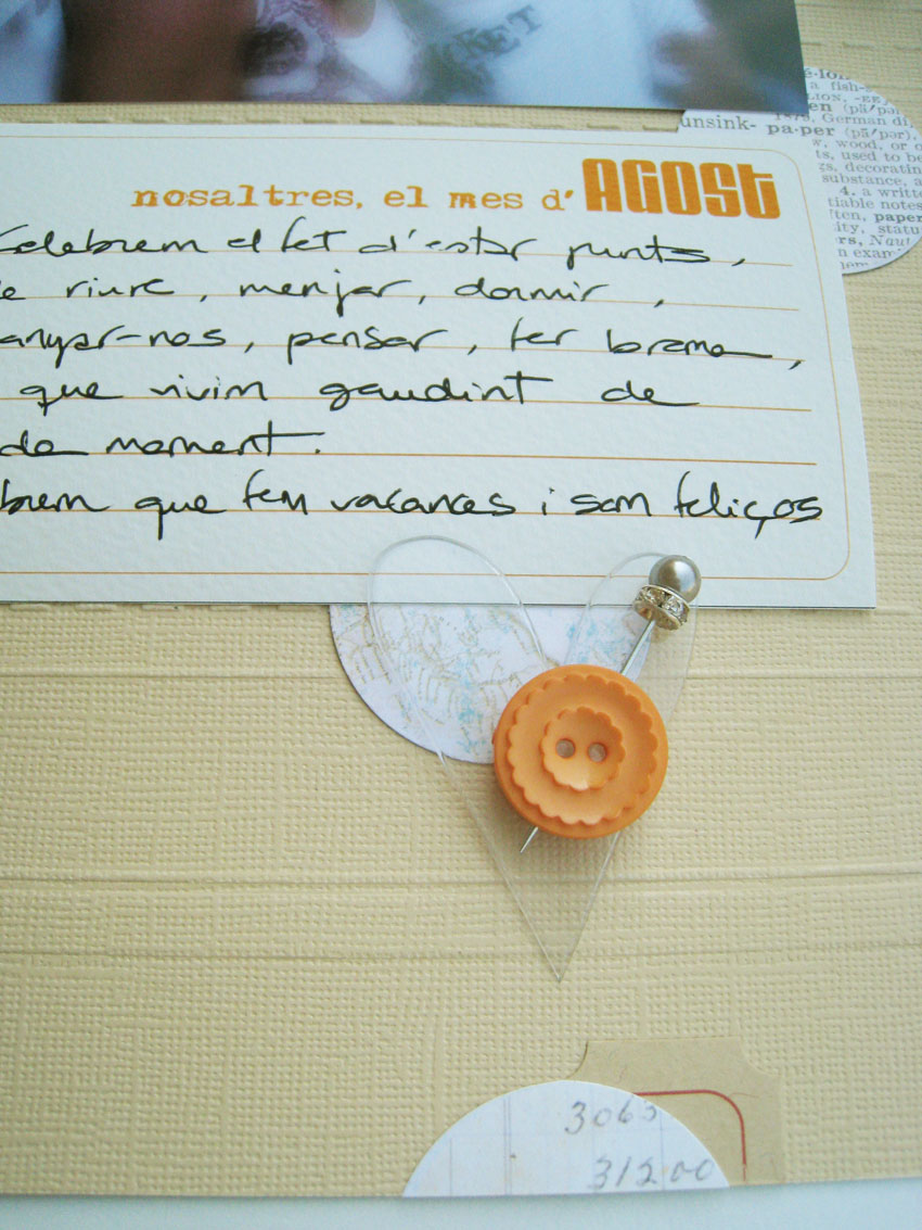 Completa la decoración unos pequeños detalles que coordinan con los colores de la página y generan estos tres puntos visuales que enmarcan. Son flores de papel, etiquetas de Making Memories de sus creaciones Vintage Findings y un botón y una aguja de Jenni Bowlin.