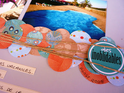 Con unos restos de papel decorado de Little Yellow Bicycle he troquelado montones de redondas en tres tamaños diferentes. Esas tres troqueladoras fueron las únicas herramientas que me llevé, a parte del X-acto y las tijeras. Con todas esas redondas he formado unas línea debajo de las fotos, creando un gran impacto con un elemento tan sencillo como unos círculos, y lo he rodeado con unas vueltas de hilo de bramante. A la derecha y entrelazado con el Bramante he puesto un adorno del kit Moments Rodons de M de mini, que destaca sobre todas las otras redondas.