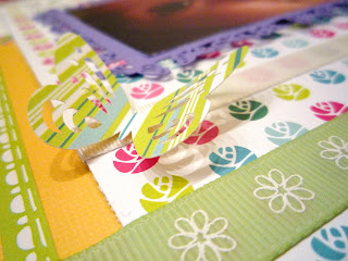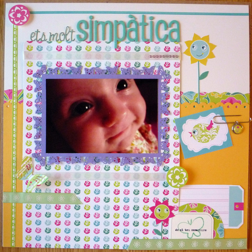 La página que os muestro hoy es sobre una de las primeras sonrisas de la pequeña Judith. He querido que la página fuera alegre y naïf, como la sonrisa de la foto, llena de inocencia. Los papeles que he utilizado son de la colección Delovely de Cosmo Cricket. He puesto una cartulina blanca como base y la he dividido horizontalmente en dos por otra cartulina amarilla y un papel decorado con el borde troquelado. Otro papel decorado esta vez en vertical sirve para colocar la foto, que tiene un pequeño marco con mariposas troqueladas.