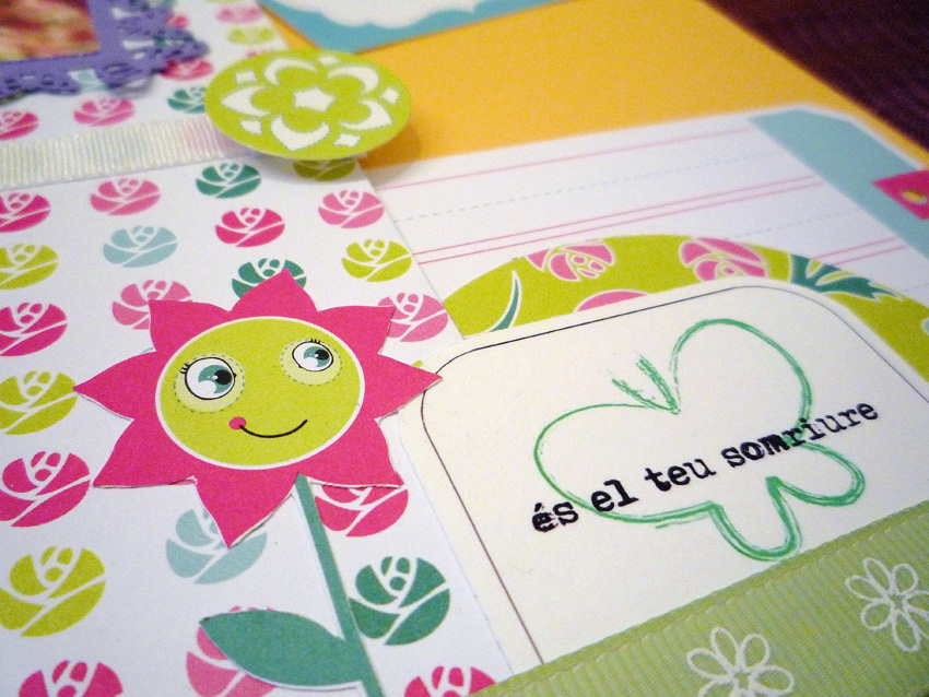 Una vez la base hecha, sólo quedaba adornar: pegatinas, etiquetas, círculos y dibujos recortados sacados de la misma colección de papeles. En la parte inferior he puesto una etiqueta de la colección Cartes d'amor de M de mini. La he recortado y he puesto sólo la parte superior con la mariposa y el texto "és el teu somriure" (es tu sonrisa) ¡parece hecha especialmente para mi página!