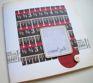 Posteriormente he pegado una tira de tissue tape de Tim Holtz a todo lo largo de la tarjeta. Es una cinta adhesiva que me gusta mucho porqué aparecen los meses seguidos y con algún tipo de detalle o con alguna anilla puedes destacar alguno como he hecho aquí con el mes de mayo. Es tan simple como perforar una redonda de 1,5" en una cartulina y después perforar una galleta de 2", dejando el primer agujero bien centrado. La primera redonda también puede ser utilizada.